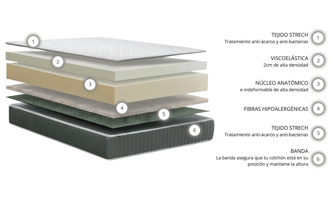 | Viscoelástica de alta densidad | Alivia la presión y mejora la postura. |