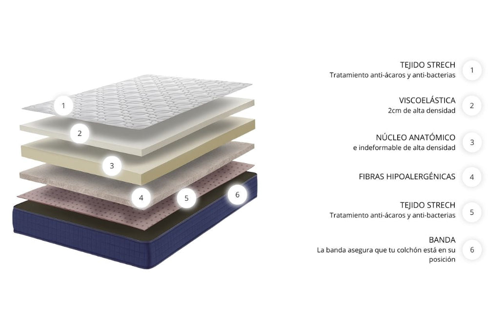 Ofrece la firmeza y el soporte que recomienda un experto. Su núcleo de alta densidad ha sido seleccionado para proporcionar una base robusta y ergonómica y una comodidad con su viscoelástica que le da ese plus extra.