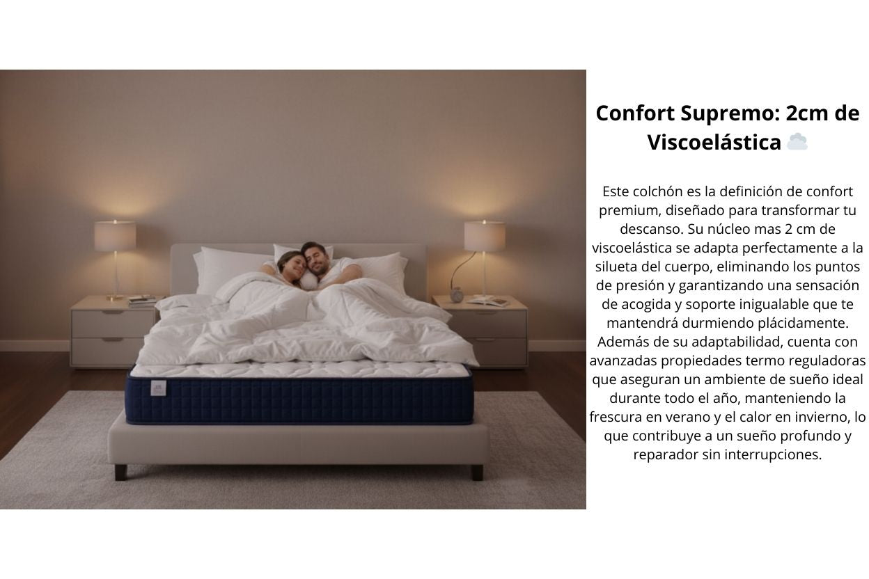 Cada centímetro de este colchón ha sido creado para devolverte el placer de un sueño profundo. Su núcleo te ofrece un soporte que abraza tu columna, mientras que la capa de viscoelástica alivia la presión, permitiendo una relajación total. Con su diseño transpirable y su protección antiácaros, te garantiza un descanso fresco e higiénico, una sensación de limpieza que notarás cada mañana. Versátil, duradero y fabricado con cuidado en España, el Visco Essential es tu nuevo aliado para dormir de verdad, demostrando que una calidad excepcional no tiene por qué costar una fortuna.
